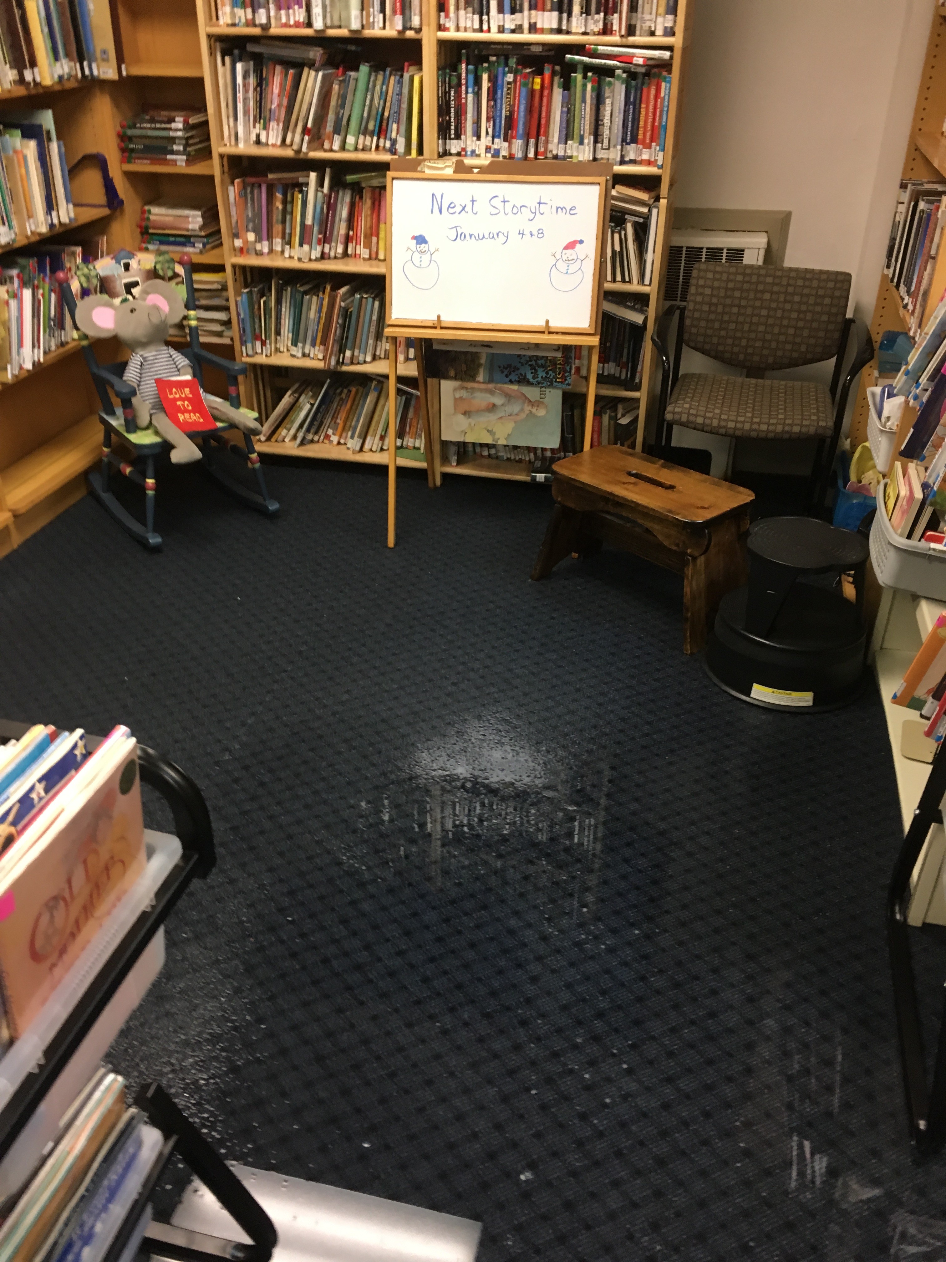 Thank goodness for the flood! We have lost our bookshelves and the library won’t look the same. But as Sam Lampert, after whose son Alan the library is named, said when I told him of the water damage, “What about the books? They are the heart of our library. “And, as far as we know, they are safe.