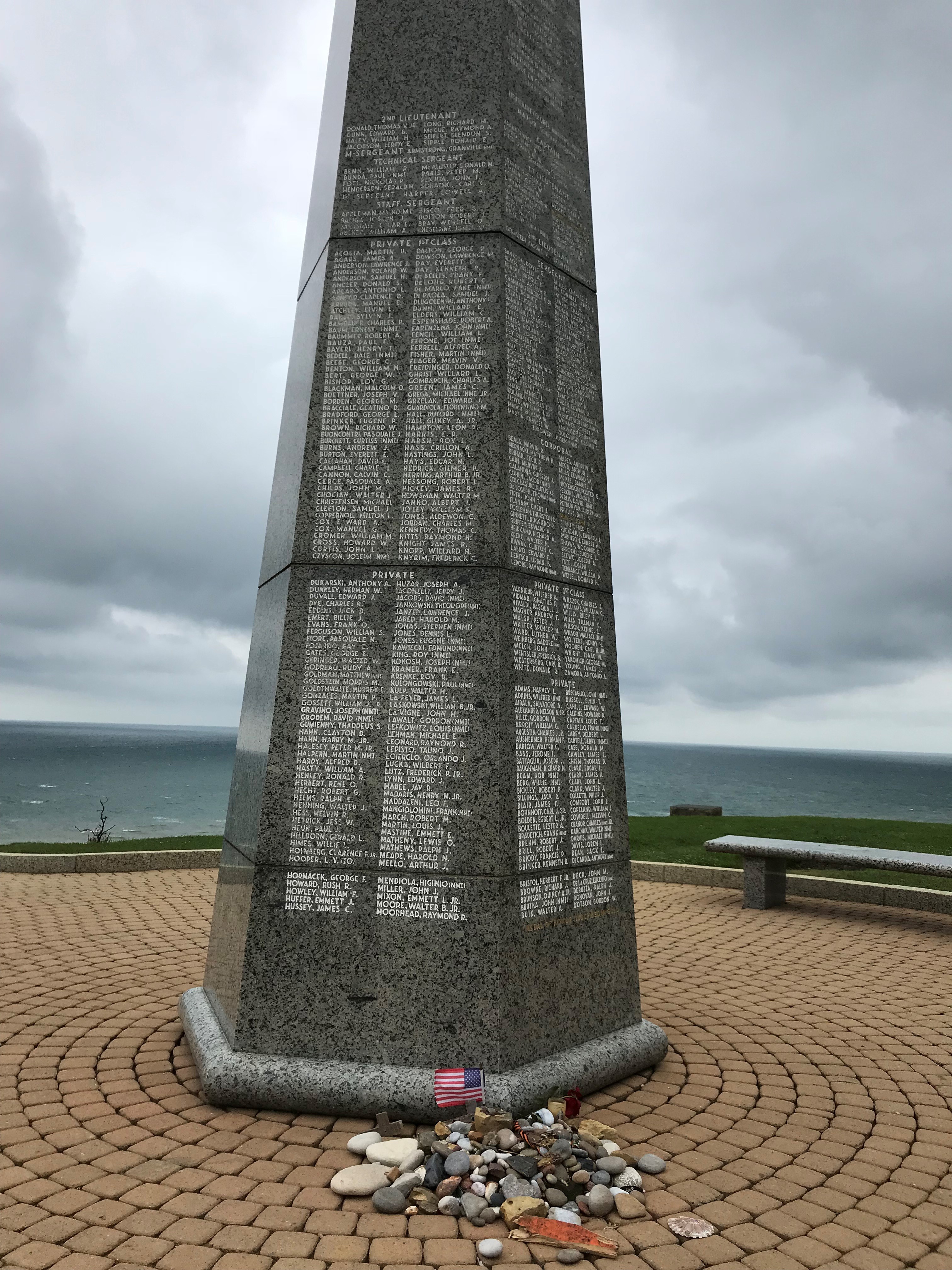 At Omaha Beach, the sky was grey and overcast; the wind whipped the waves and small flags that lay at the foot of the memorial stele listing names of American dead.
