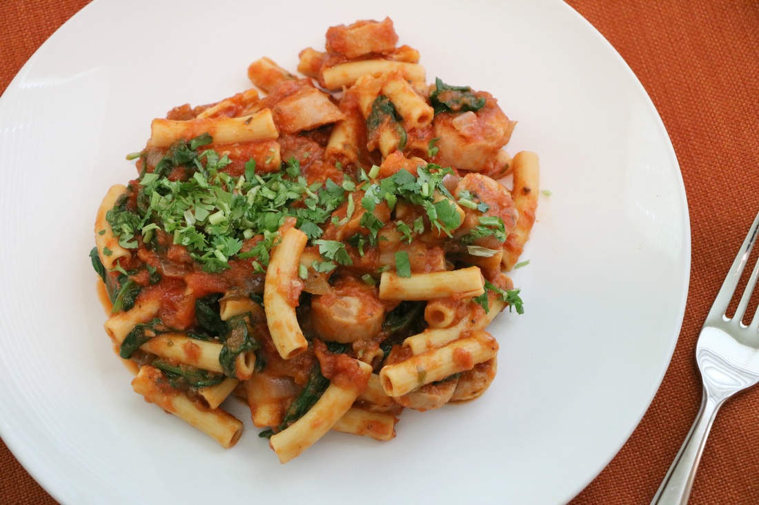 Notes: It’s not a mistake. DO NOT PRECOOK PASTA. That’s part of the magic of this dish. Add additional liquid if leaving out wine. Trader Joe makes a good vegan sausage. Make sure it is browned well before adding other ingredients.