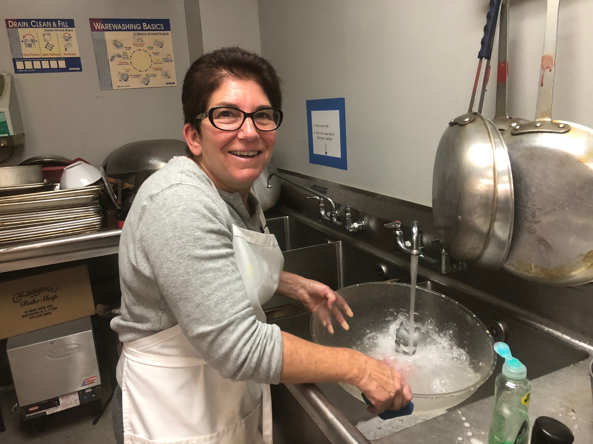 Dessert was applesauce and cookies. We had another night with a skeleton crew. Sara Ann Erichson and yours truly were sous chefs, servers, clearing etc. Amalia did her usual top notch job of serving and clearing. MESH staffer Joe Tyson handled set up, then serving and clearing with Adrienne. Fern was at the sink doing some pots and pans until our custodian Kevin took over to complete the task.