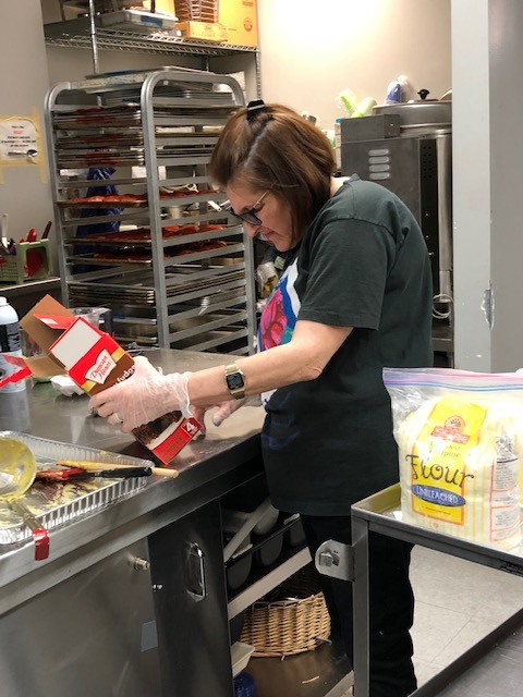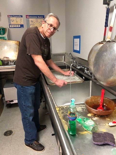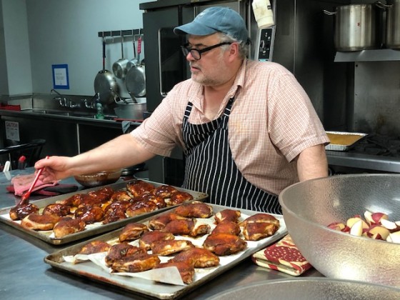 We had another full house with 24 guests at the MESH Café as well as providing 5 take-away meals. Chef John Lasiter prepared a sumptuous meal with assistance from Beryl Hiller. The meal started with meat empanadas and coleslaw. Next course was an overflowing plate of barbeque chicken, roasted potatoes provencal, more coleslaw, and corn bread. For desert there was brownies and ice cream. Teen volunteers Amalia, Elana, Orly, and Jonah  assisted with preparing and plating the food while Lou Hammerman manned the sink.