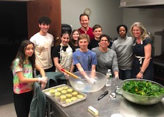 Chef Fern had an able team of adult and teen prep cooks/servers/dish washers to insure an easy service and kitchen clean up. Dinner was a previous month’s request of fresh baked Salmon with yogurt/dill sauce (tzatziki) accompanied by very creamy mashed potatoes and steamed string beans. Our guests began the meal with a springy feel of fruit salad followed by spinach salad. Dessert was cookies and tangerines. We did have one vegetarian who did not eat fish (whom I had met the previous day in the streets of Montclair so I knew he was coming – I bought vegetarian puffs for him).