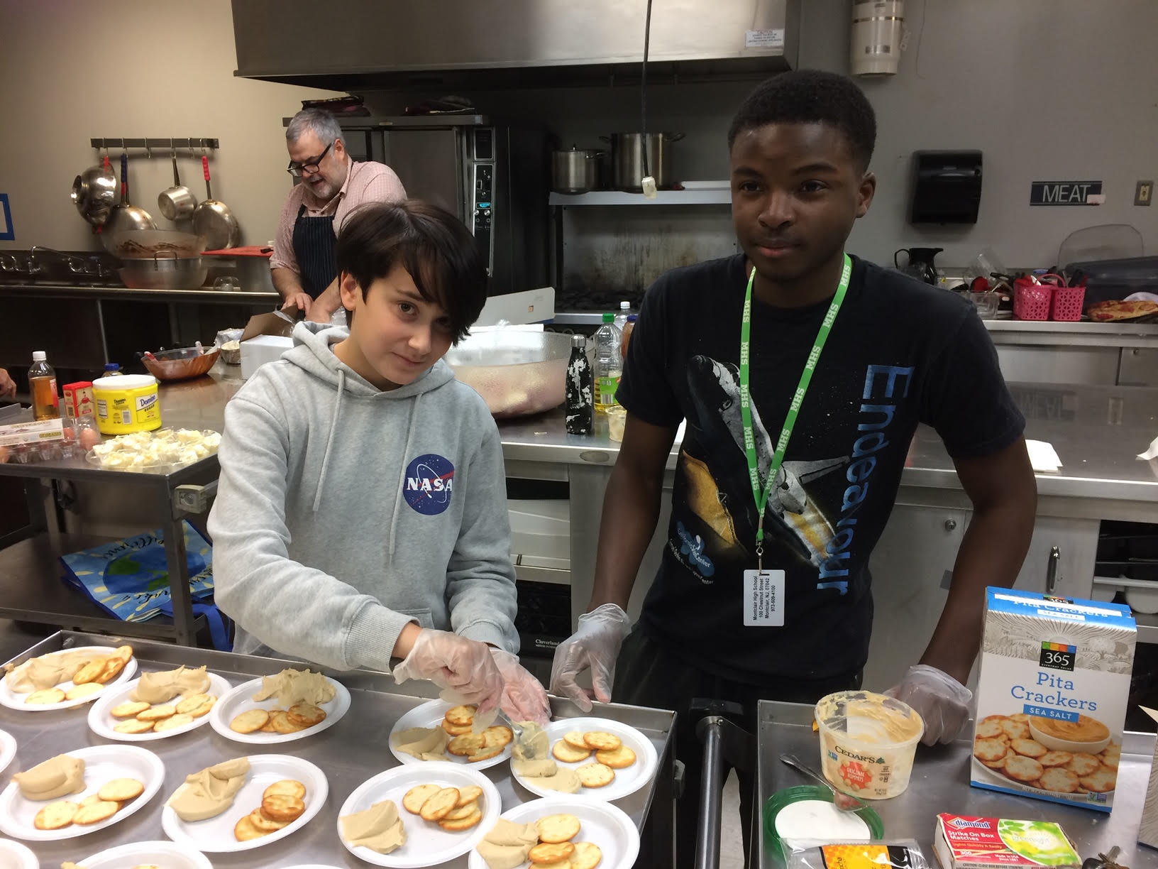The Lasiter family (John, Adrienne, and Elliott) stepped up with a delicious down home meal of pita chips and hummus, BBQ chicken, roasted potatoes, and cole slaw, rolls and spread, topped off with brownies and ice cream. Teen helpers included Glenfield student Jonah, and Montclair High’s Noah. Susan Rosenblatt washed a big stack of dishes. We all got a work out going up and down the stairs! Bonny from MESH and Joseph on security rounded out the crew.