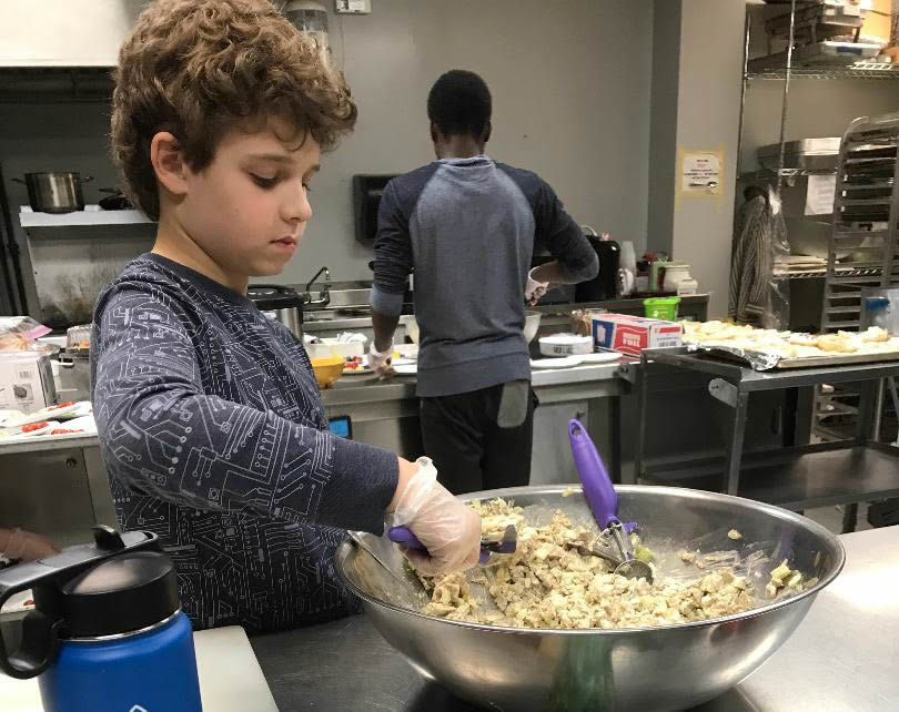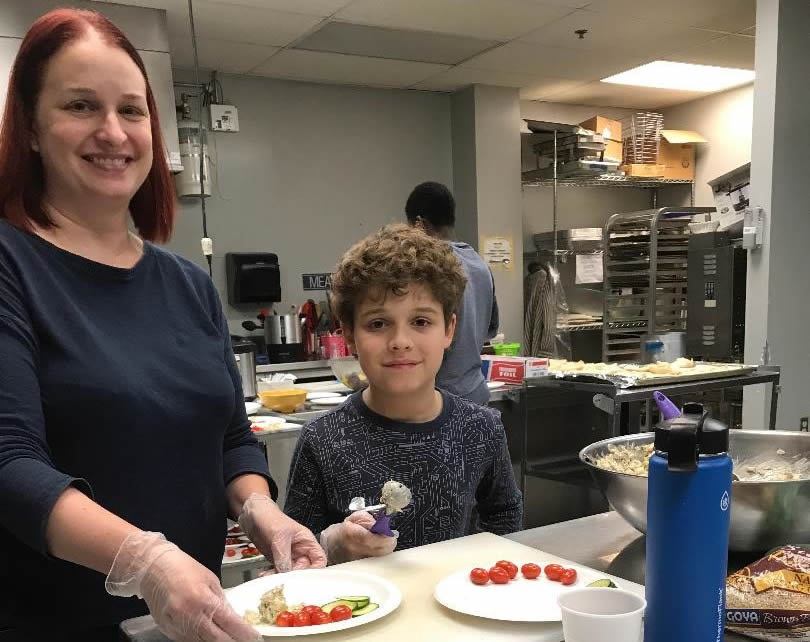 New volunteers Shomrei member Meredith and her son Gabriel along with teen volunteer Noah helped in the kitchen with plating and in the Cafe with serving. Gabriel was a whiz with the tuna scoop and Noah left the dishes clean and neat.
