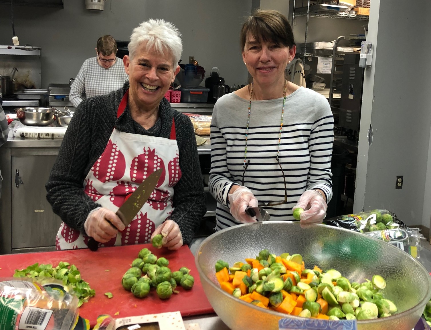 We had helpers galore, fortunately, since there was a lot to wash, chop, skin, prep, serve (upstairs and downstairs) and clean up. With so many hard working helpers, Aileen remarked that everything was ready to serve by 6 pm! Shomrei helpers were Linda Blume, Carol Katzman, Beryl Hiller, Lanny Kurzweil, Carolyn Lack, Melanie Grossberg, Steve Hoviss, as well as Norm and Vicki Pollack, friends of Aileen. Lucy Segal, MESH Chaplaincy Intern, and her daughter, Skyler, also pitched in, in addition to Montclair High School volunteers, Jahiaida, Jon and Jordana. MESH staffers, Bonny and Joe, ensured that the evening ran smoothly. A note of special Mazel Tov to Bonny on the recent birth of her first grandchild, Taylor.