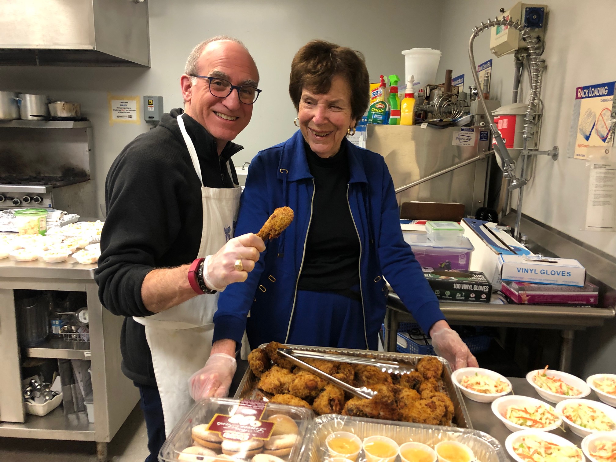 Uber Chef Aileen Grossberg orchestrated the meal beginning with a hearty vegetable soup with meatballs served with a toasted baguette. The main course was Southern Style Oven Fried Chicken, Roasted Brussels Sprouts, Butternut Squash and Craisins with a Dijon Vinaigrette. Also potato latkes with apple sauce and a side of semi-homemade coleslaw. Dessert was Aileen’s homemade Chanukah Apple Cake, fresh fruit cup and a scoop of TJs Soy Ice Cream. Our guests were ecstatic! Aileen also prepared a goody bag for each guest including a water bottle, clementine, snack bar.