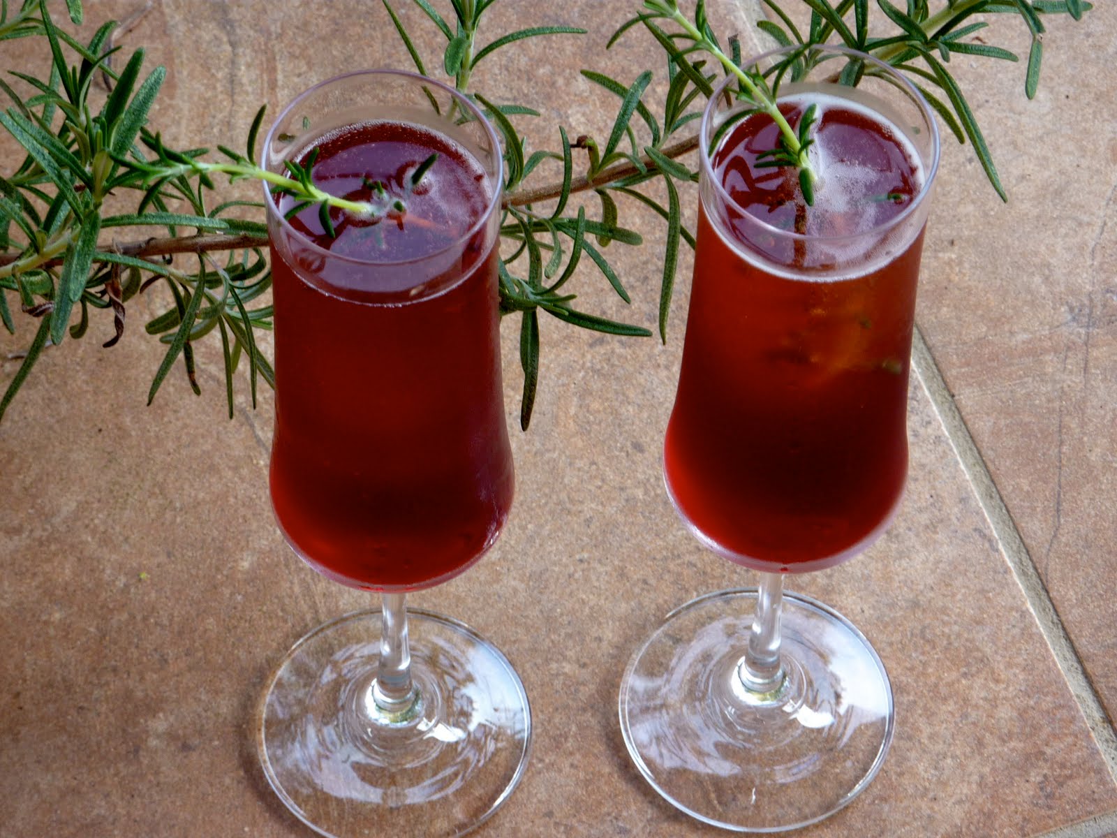 - Pour 2 tablespoons pomegranate juice and 1 tablespoon rosemary syrup into 4 Champagne glasses. Top each serving with 1/2 cup Champagne. Serve immediately.
