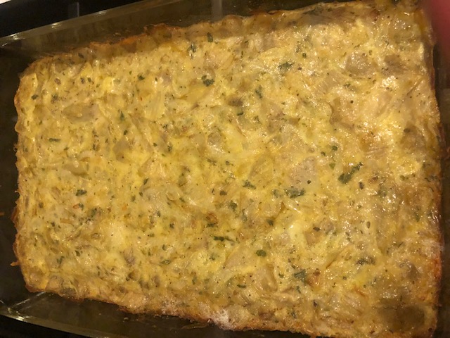 - Heat the marinade in a pan. Add the onion & garlic; sauté until onion is transparent, about 5 minutes. Mix together the cooked onions with the artichoke hearts, eggs, bread crumbs & parsley. Add the cheese and mix to combine. Spread the artichoke mixture in the baking dish. Bake for 25 minutes, until set.