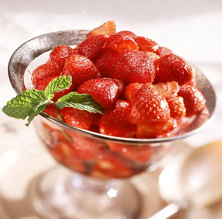 Who’d ever think of vinegar for dessert? But as a marinade for strawberries it turns them into something special to serve over fruit, on ice cream, spongecake or brownies or even alone is an elegant crystal dish.