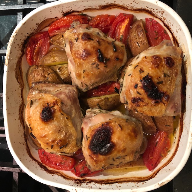This is another quick and easy one-pan chicken dish. Inspired by the chicken and kale recipe, I decided to try other combinations while I’d been teaching from home during the pandemic. I was able to get the dish ready for cooking before my afternoon class and put it in the oven immediately afterwards.