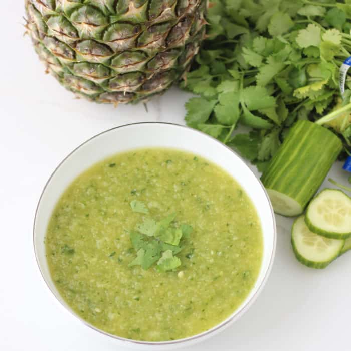 Start with a cold soup like pineapple gazpacho (See: Cool Food for a Hot Day, Jun 26, 2016). You’ll need a good knife and some kind of blender to puree the mixture. It goes together quickly especially if you buy a precut pineapple. And it can be as spicy as you wish with the addition of extra jalepeno. Or try a little of Trader Joe’s Chili Lime seasoning to spice up the soup. Pomegranate seeds or plump blueberries might make a colorful garnish.