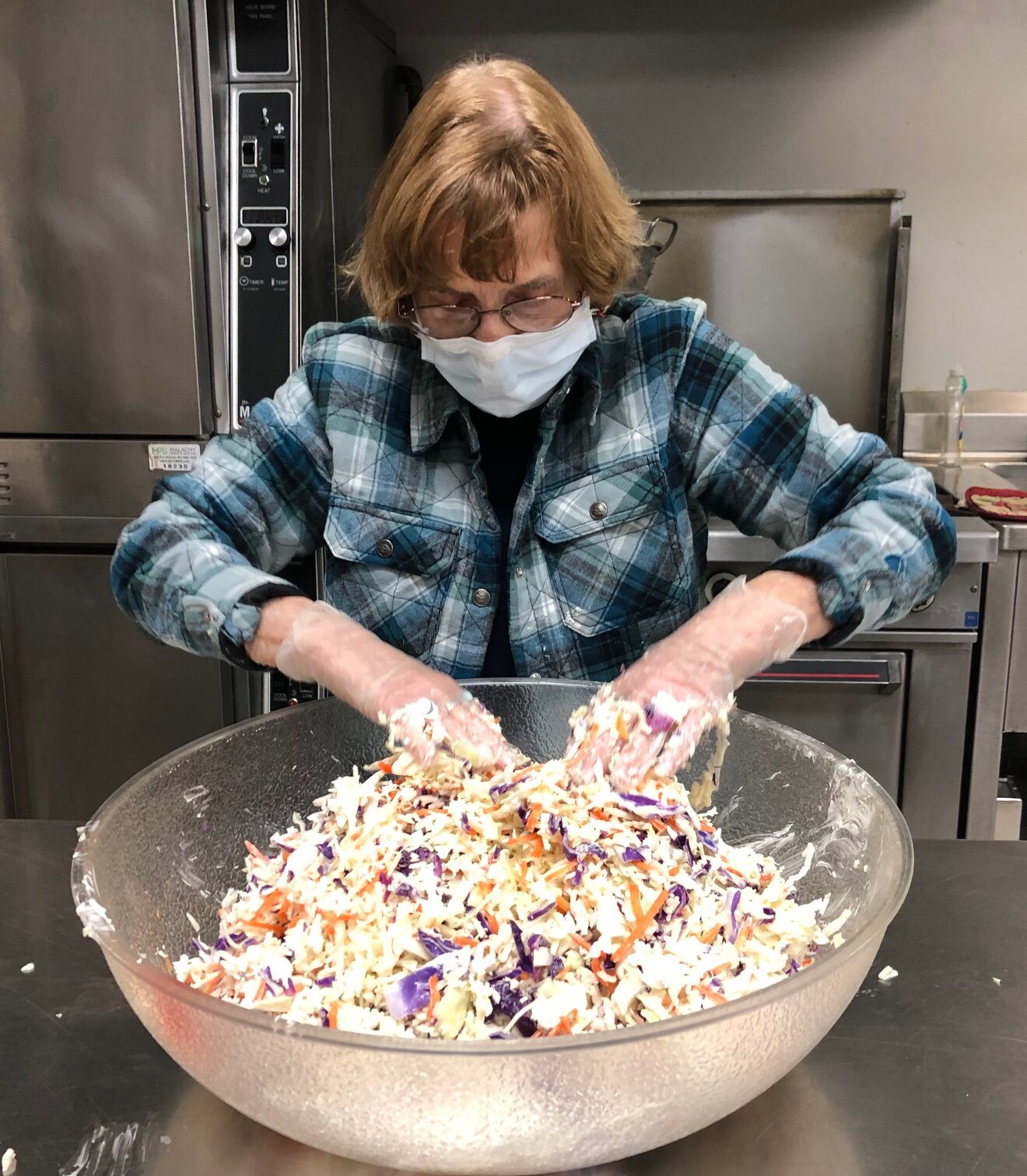 It was “all hands” in as Linda Ariel and Susan Rosenblatt assisted Chef Sarita Eisenberg in cooking for our MESH guests – making chicken with barbecue sauce, coleslaw and roast potatoes.