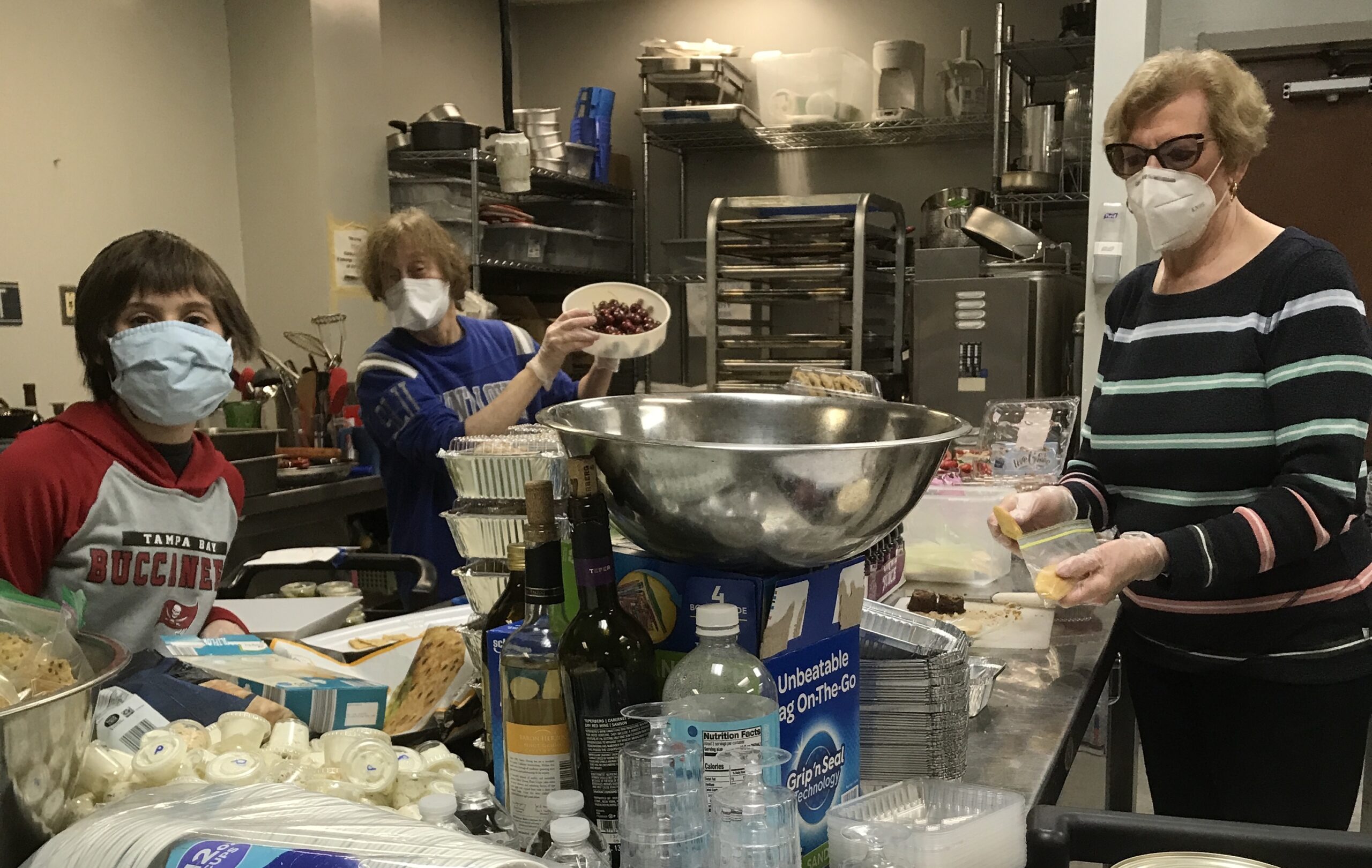 The kiddush crew was out in full force prepping for this kiddush which was just a bit different from what they used to do. Instead of artfully arranged platters, there were trays of individual containers to grab and take to the tables. Cookies were snuggled into a foil pan with a see through tops so that the contents could be seen and labels abounded to identify the foods on display.