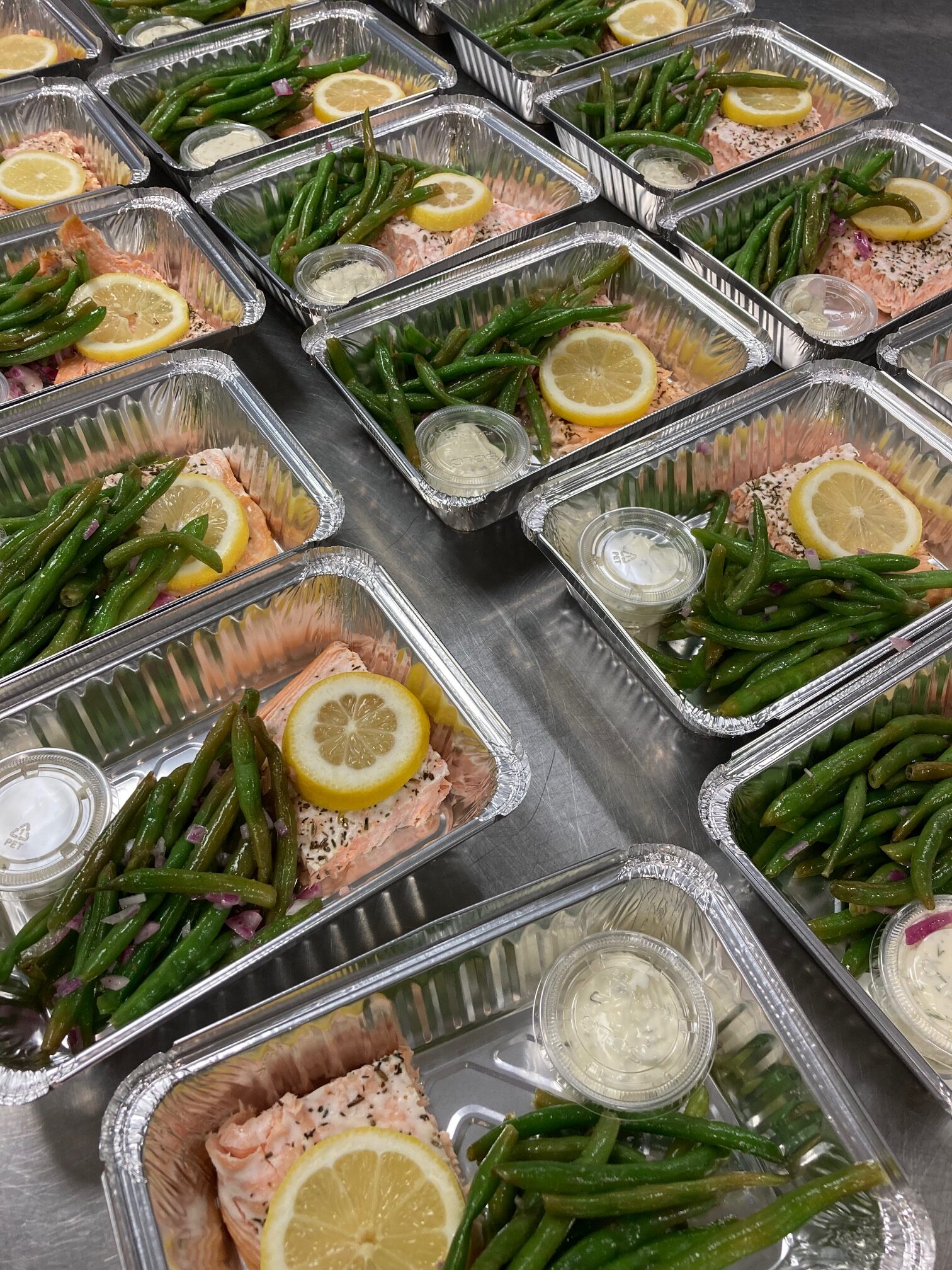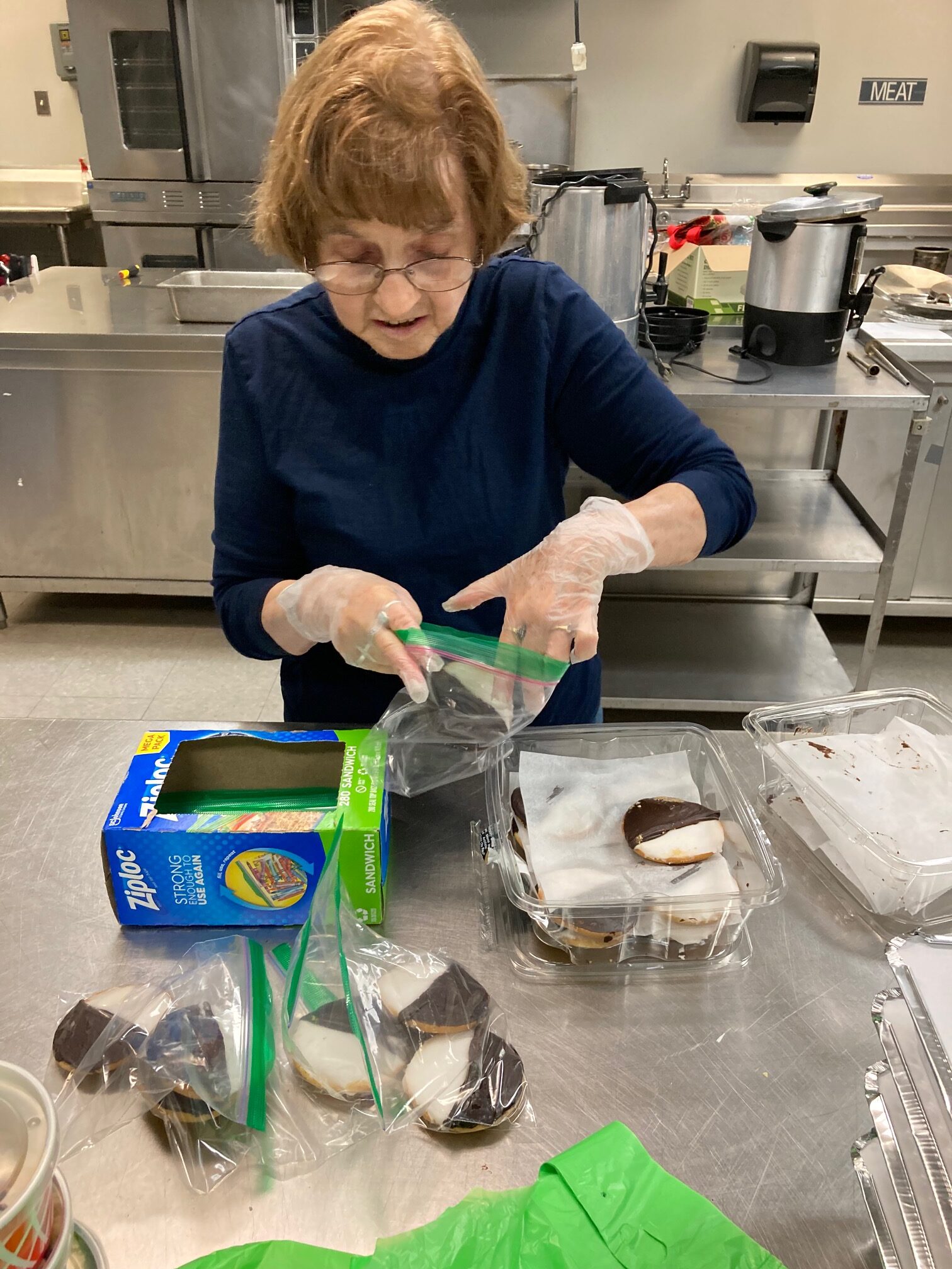 On Tuesday, we had the awesome threesome team of Chef Fern Heinig and Packers Alex Kent and Susan Rosenblatt. Fern prepared her classic Baked Salmon with a lemon/dill sauce, sliced lemons, Green Beans, Mediterranean CousCous Salad, Tangerines, Rolls, Black and White Cookies, Breakfast Bar and, of course, a water bottle. The meal is served at room temp which makes it easy for the Cook to prepare in advance and for the Packers to assemble without heating up.