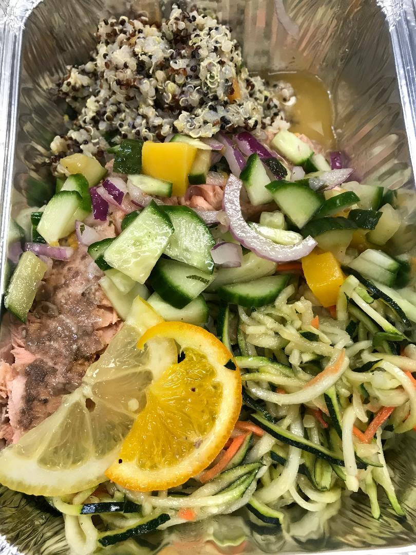 Thanks to a bountiful weekend in Zelda’s and his honor, there was much food to repurpose. The generous meal consisted of egg salad with lox and crackers zucchini noodles, quinoa, and pomegranate baked salmon garnished with a dollop of cucumber and mango Israeli salad. This was all accompanied by a green salad, a container of potato salad and a warm roll.