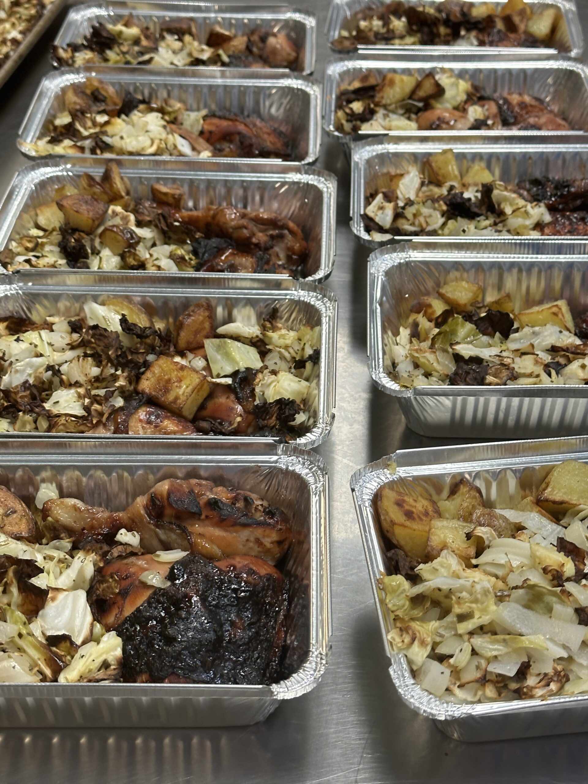 Dinner included strawberry-balsamic glazed chicken, roasted potatoes and roast cabbage and onions. There was also a side salad, with cucumber and corn kernels added to extra arugula and tomatoes from last weekend’s kiddush. Dessert included two mandarin oranges and always popular oreo cookies. The meal was rounded out with a bottle of water and a roll plus a breakfast bar contributed by Gail Stocks.