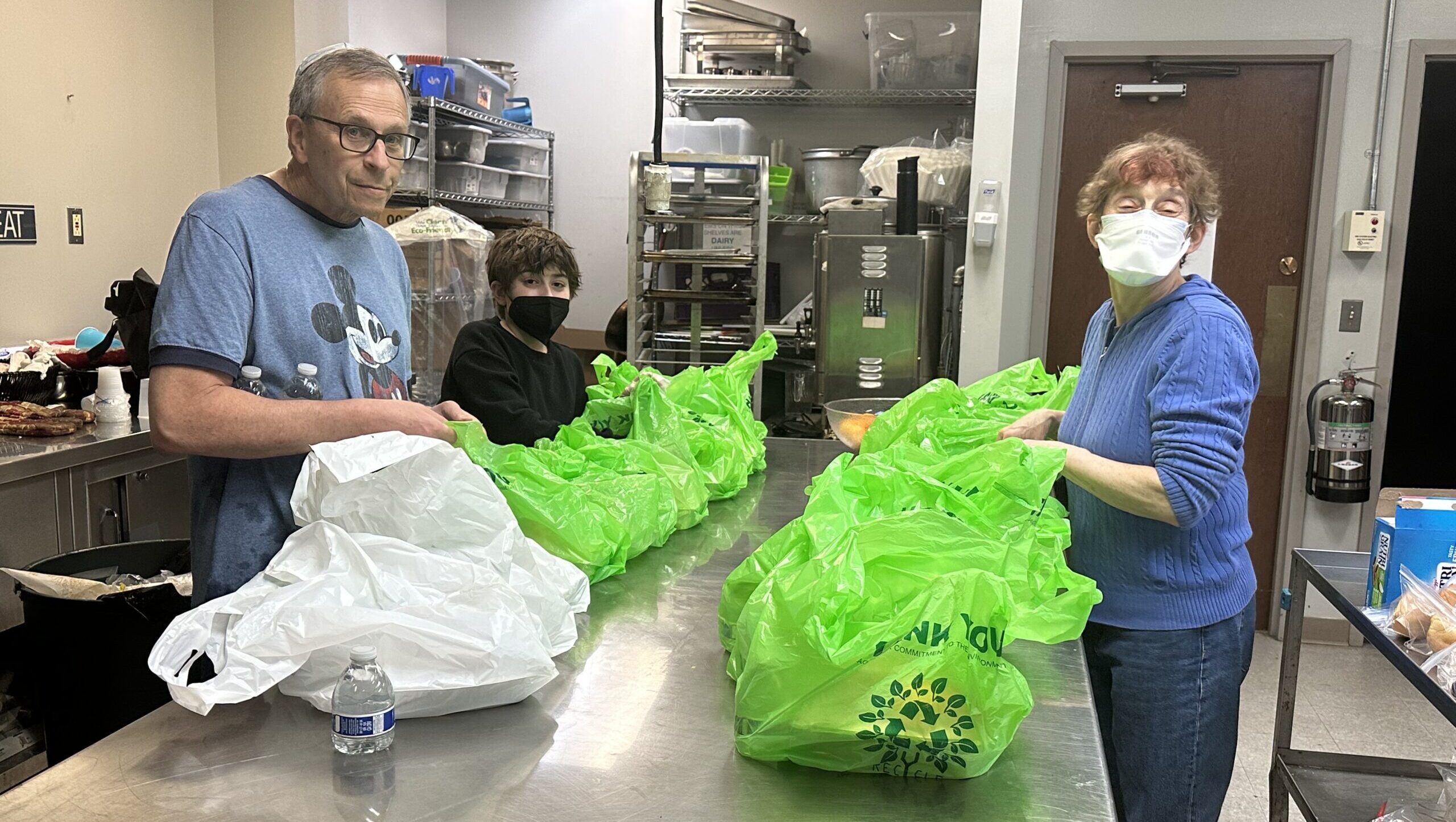 Chef Sarita Eisenberg prepared 25 to-go meals assisted by Lou Hammerman, Linda Ariel and teen helper Jaden (taking time out from b’nai mitzvah preparation).