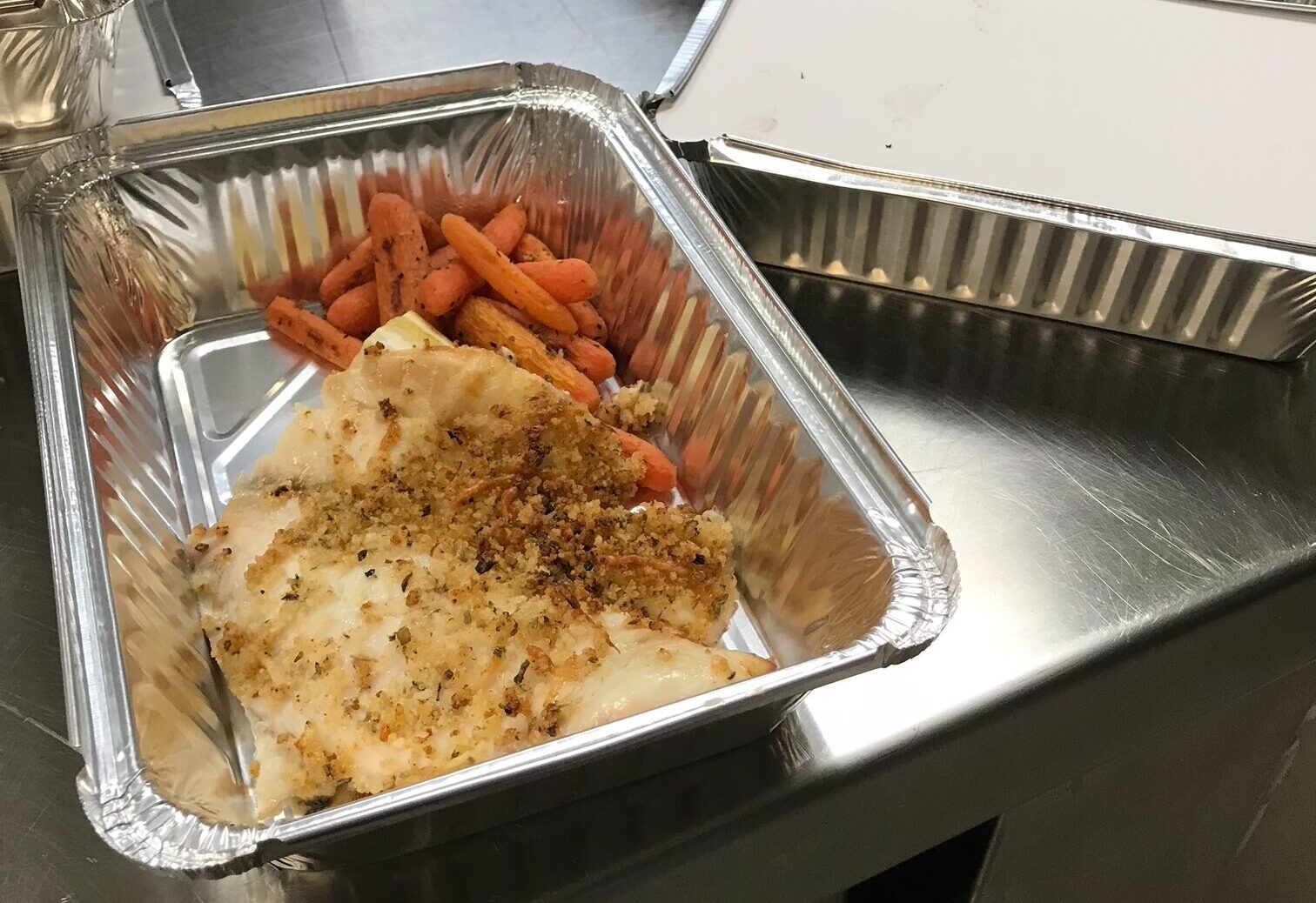 We prepared a filling – and colorful- meal of semi homemade coleslaw, bright with orange carrots; a marinated tomato, cucumber and multi-colored pepper relish; parmesan and garlic crusted baked tilapia, with a piece of lemon; roasted carrots with herbs. The main meal was accompanied by a buttered roll. A juicy orange and a homemade cookie (supplied by Lindsey and Jordan Sag) completed the meal and filled the bulging bag.