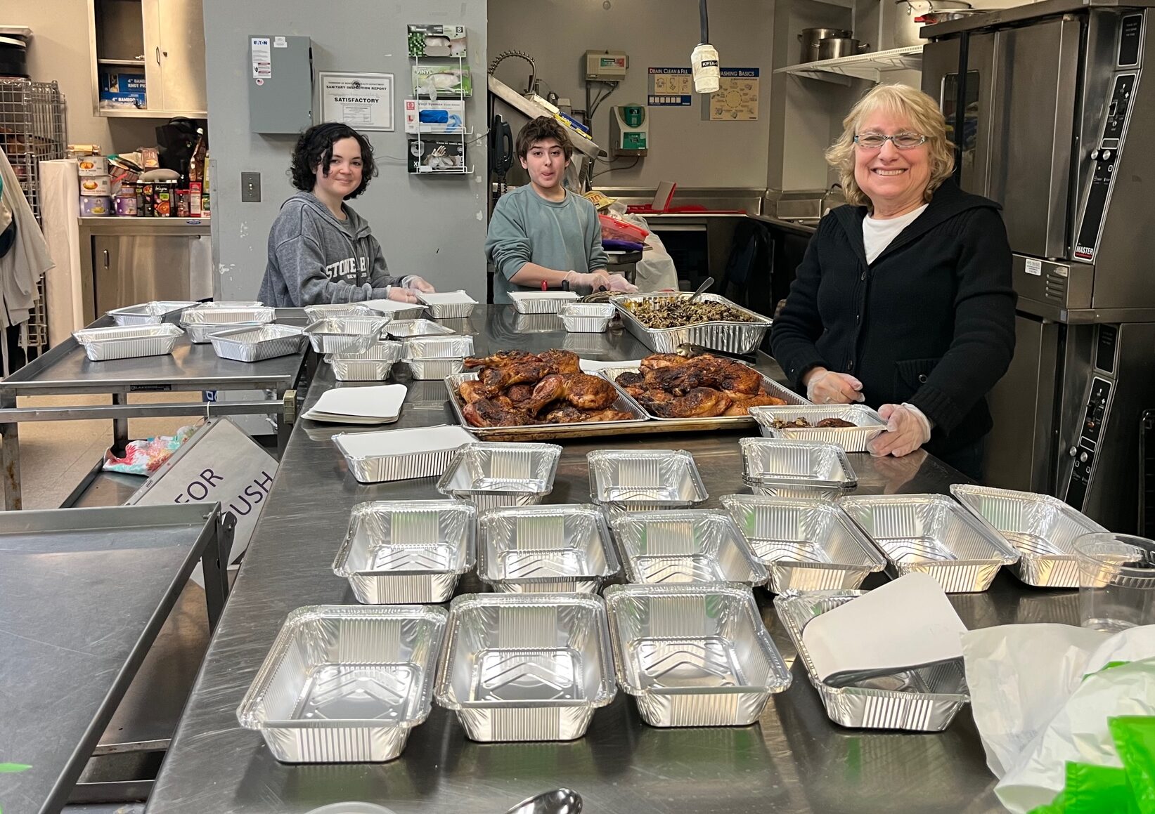 We had a terrific team preparing, packing and delivering a very hearty and nutritious meal to our MESH guests. Joan Zief and Lynne Kurzweil organized the meal around sumptuous vegan leftovers from Saturday’s kiddish, graciously donated by the Lucey family. Kitchen helpers were Alex Kent and teens Hailey and Jaden.