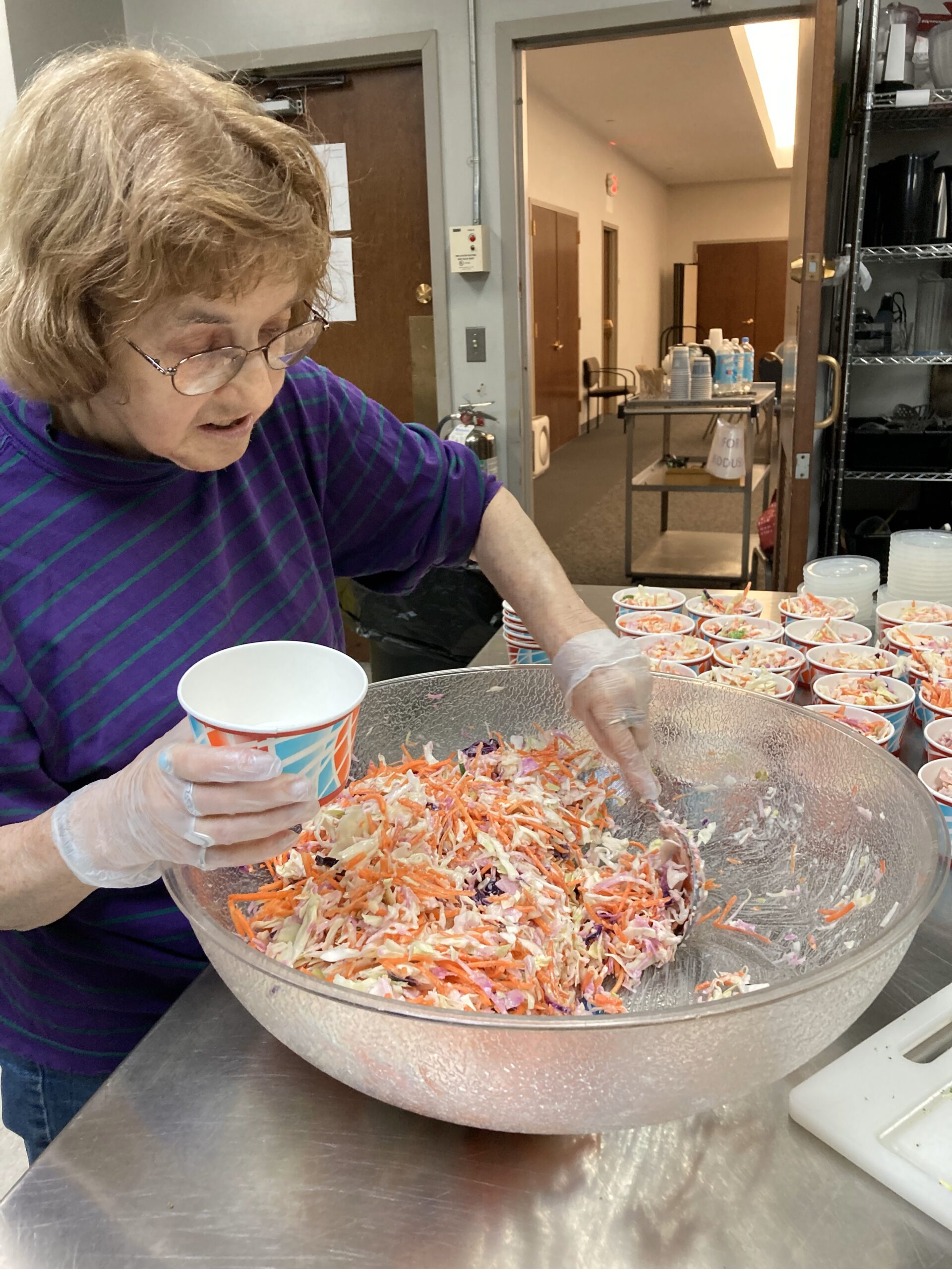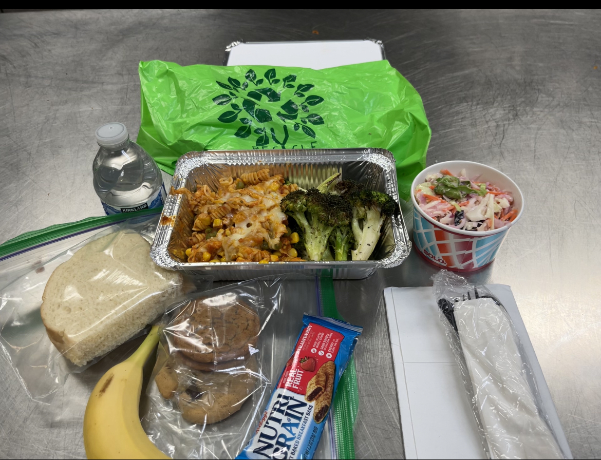 Main course was a one pan Pasta Bake with rotini, mushroom tomato sauce, corn, peas and lots of cheese. Ask Aileen for the recipe. (You don’t have to cook the pasta and the options are infinite for swapping out/adding ingredients!). The meal included Roasted Broccoli, Semi-homemade Cole slaw with green and red cabbage and carrots, Italian Bread, Banana, Granola Bar, Chocolate Chip Cookies and a Little Debbie Oatmeal Cake for dessert and a water bottle. The guests are always very appreciative when we drop off the meals, saying “Thanks so much!” as they dig into their dinners.