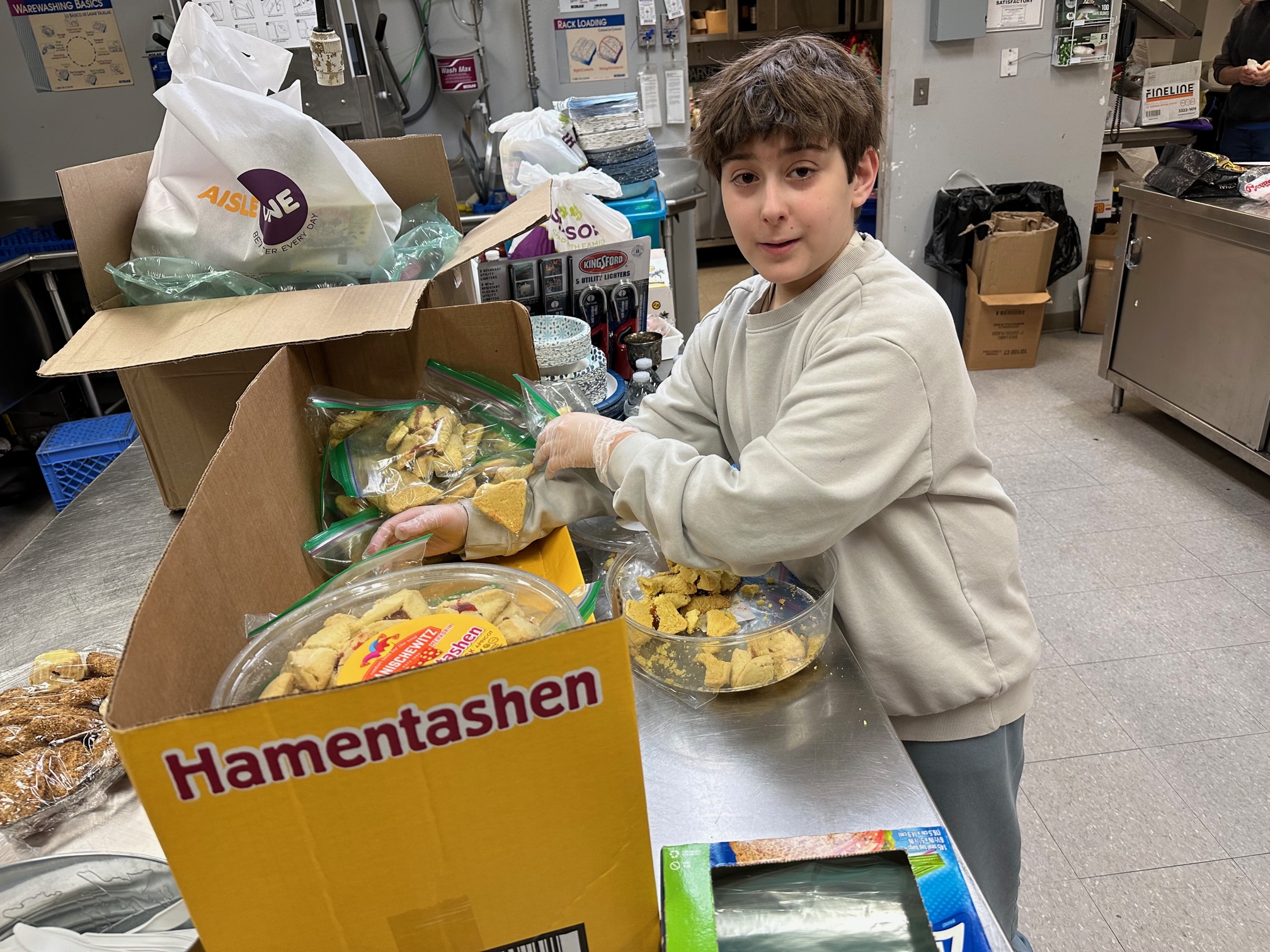 The cooking and packaging took just over two hours in the Shomrei kitchen. Linda Ariel compiled the chicken. Lou prepared the potatoes. Susan Rosenblatt and Sarita chopped lettuce and tomatoes and also added shredded carrots and corn kernels to the leftover chopped salad from kiddush. Teen Jaden packaged up leftover hamantaschen and bread as well as counting out containers, bags and utensils. Lou did the clean up.