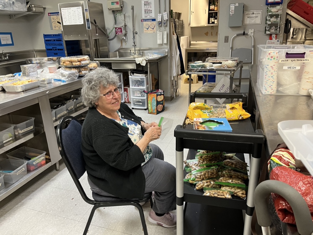 In addition to 32 hot meals, we also packed up 11 cold meals consisting of an 8 oz container of whitefish salad, a bagel, and health salad, plus a hearty portion of Mac n cheese, cookies, clementines, peanuts, taffy, cookies, water and breakfast bar. Many thanks to the Dembrow family for contributing all the leftovers from Saturday’s kiddish. Aileen Grossberg stopped by to help pack up and then delivered the cold meals plus additional leftover platters of tuna and salads which MESH will use to supplement meals later this week. Joan and Lynne completed packing the hot meals and Lynne delivered the rest of the bags to The Office while Joan finished cleaning up.