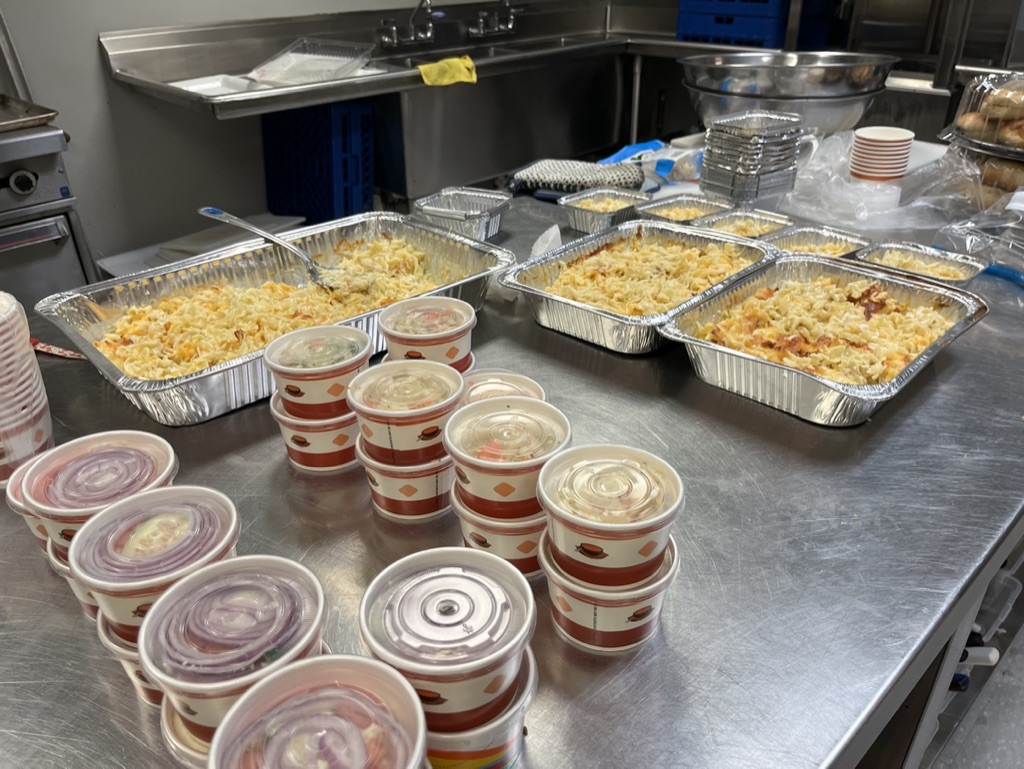 Master Chef Joan Zief cooked up a down home feast for 32 of our MESH guests. Along with Sous Chef, Lynne Kurzweil, the main dish included tilapia with a roasted garlic and herb panko crust, homemade baked macaroni and cheese and sautéed greens (collard and mustard). Rounding out the meal was a slice of whole grain bread, clementines, cookies, peanuts, taffy, a water bottle and a breakfast bar for the morning.