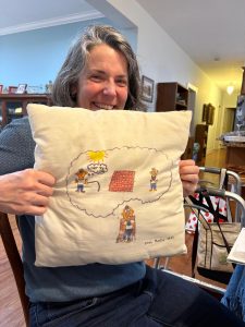 So we celebrated Passover on the Shabbat before Passover and called it the crazy mixed-up seder. The table was filled with our Passover artifacts – a hand-embroidered matzah cover, Rebecca’s 40-year-old pillow from religious school (do children make Passover pillows anymore in religious school?), the good china and silver.