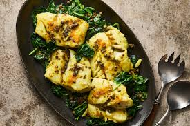 - Drain spinach and spread on platter. Place fish on top and spoon warm sauce over fish. Garnish with extra capers and serve immediately.
