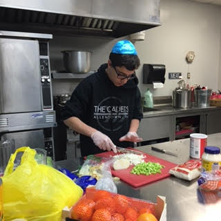 Teens Lewis and his friend Max and adult Susan Anderson joined Captain/Cook Fern in the preparation of a hearty meal for a cold night. Teen Amalia and MESH staffer, Adrienne, took charge of setting the table and preparing the drinks for our guests.