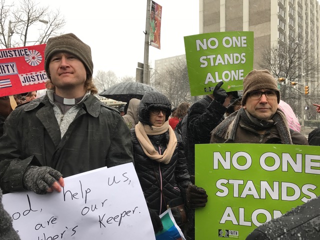 The vigil was organized by Faith in New Jersey, a local affiliate of PICO, a national network of faith-based community organizations that seeks to provide an opportunity for people to take action. We marched to the courthouse, singing and chanting with banners held high, to meet Mr. Guerrero and his lawyer before Mr. Guerrero’s hearing. And then we waited outside in the cold and snow.