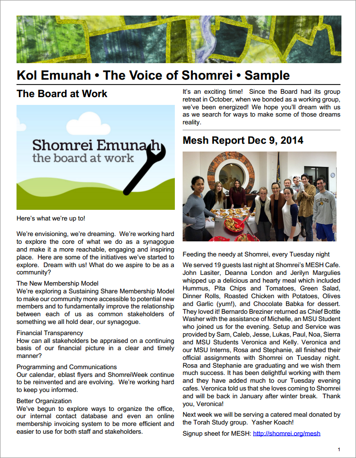 Starting in January of 2015, Kol Emunah will no longer be widely circulated in the printed format. The online blog (shomrei.wpenginepowered.com) has become the new “Voice of Shomrei Emunah”. Congregants without online access will continue to receive a monthly printed version by mail (of the snail variety) which will automatically be generated from information on the blog.