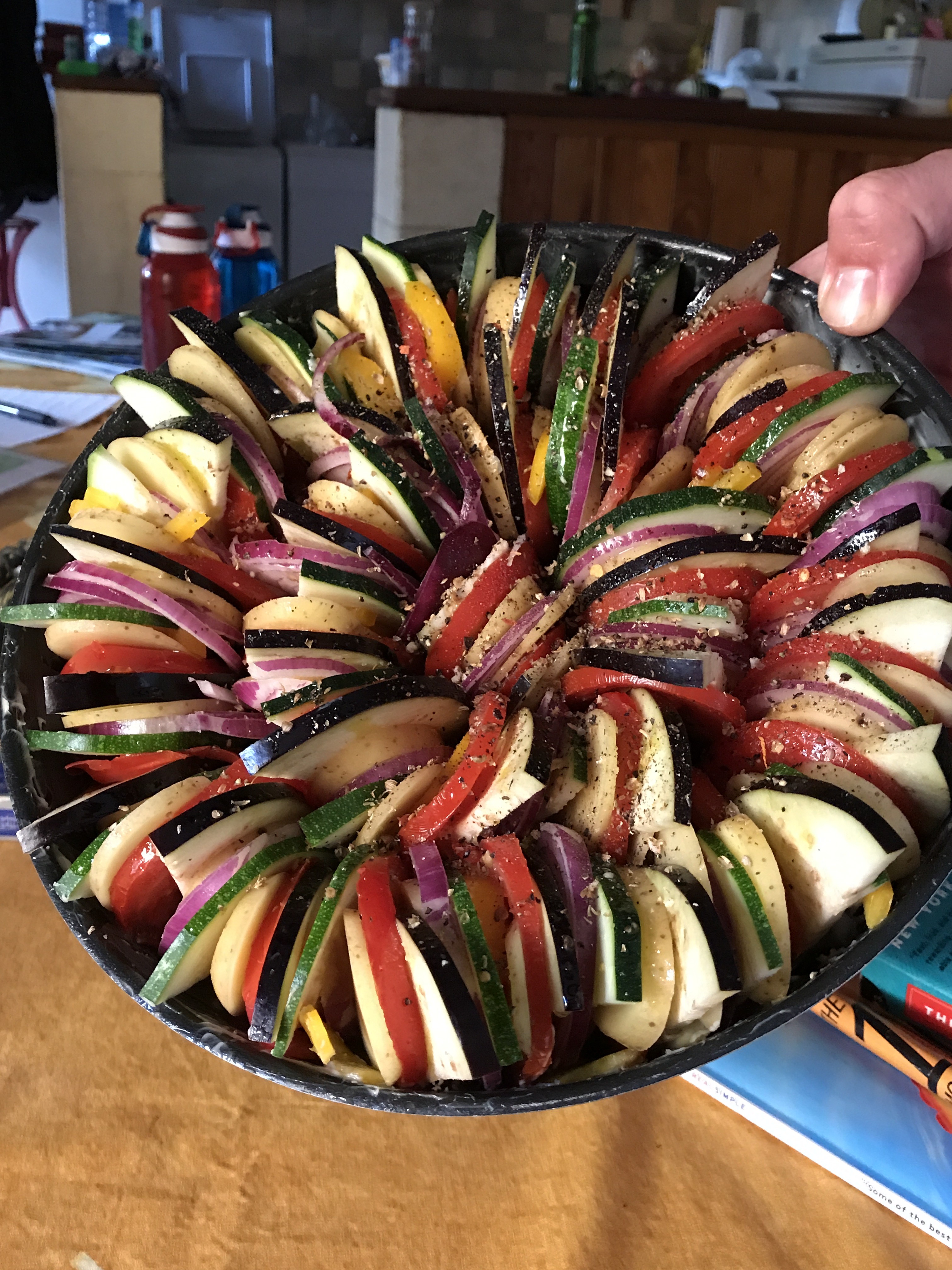 While we were “roughing it” without the internet or dishwasher and eating off unmatched dishes, my son-in-law made this traditional French Provencal vegetable dish. It takes a little time to prepare but is a show stopper and can serve as a vegetarian or vegan main dish with some good bread.