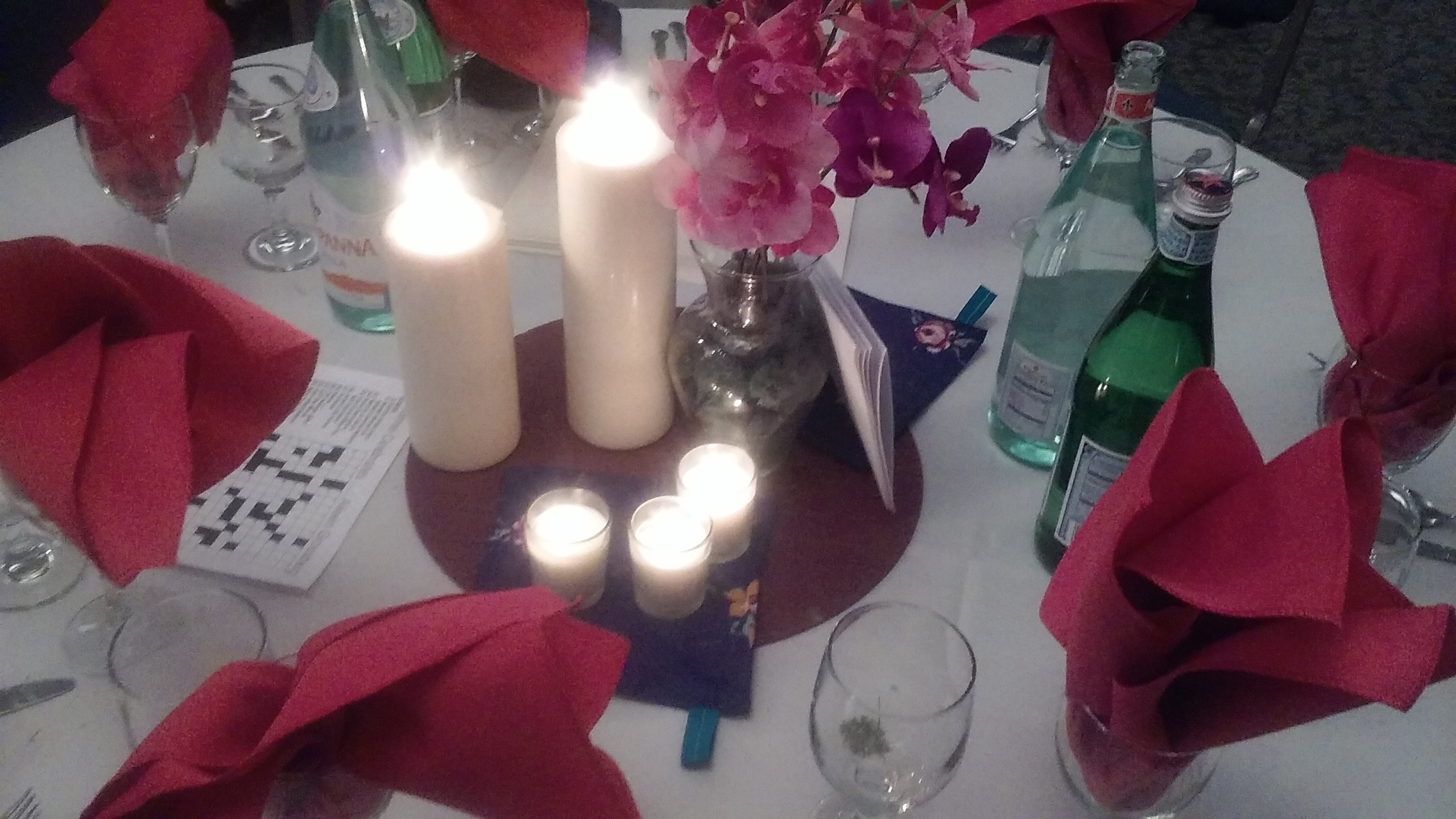 By all measures the Shomrei Celebrates . . . Aileen Grossberg event was a big success. One hundred and thirty people feted our amazing Aileen, ate John Lasiter’s stupendous dinner, imbibed the best whiskey money could buy, watched a fun-filled video tribute produced by Fran Legman and Nick Levitin, and heard our resident poet laureate Judy Wildman read a tribute to our honoree. Everyone mingled happily in this loving atmosphere. The centerpieces, designed by Nancy Beslin and Carol Cathey, were the height of creativity, reflecting two of Aileen’s major areas of interest – books and cooking. Candles on each table conveyed intimacy and romance.